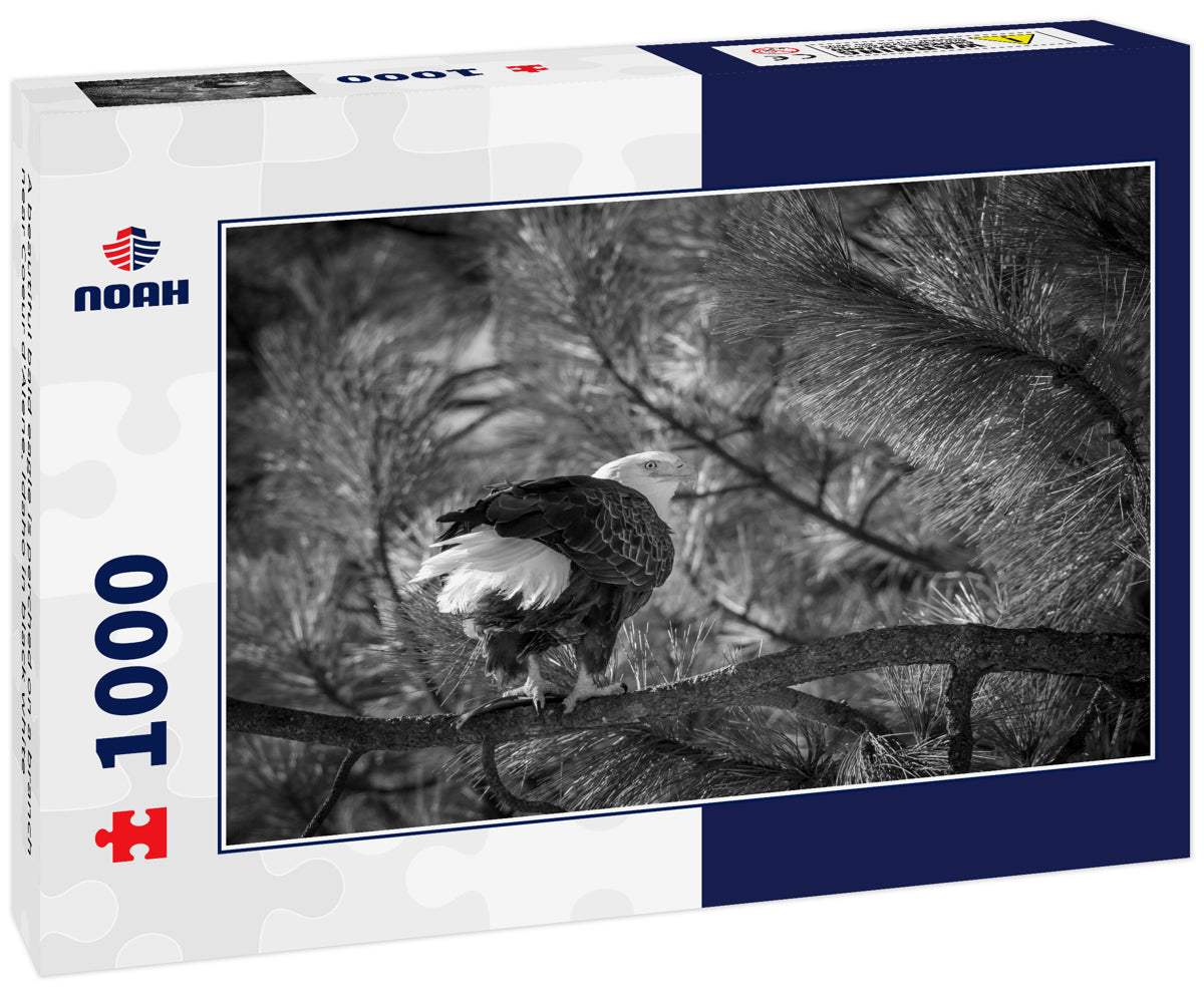 A beautiful bald eagle is perched on a branch near Coeur d'Alene, Idaho in black white